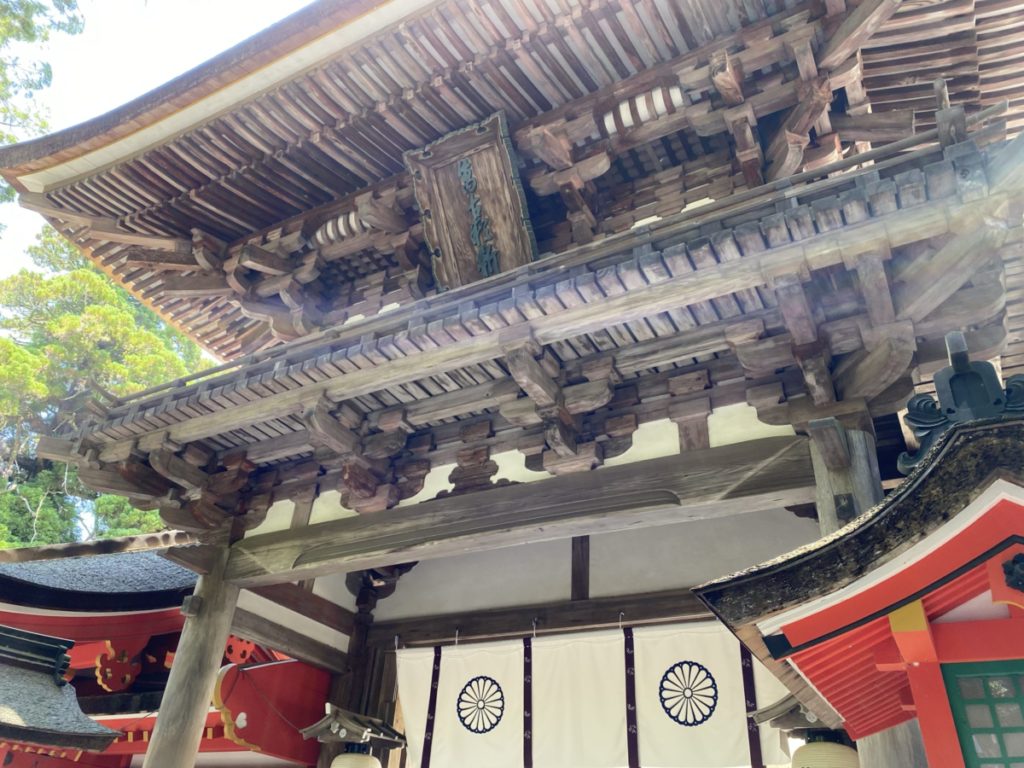 武骨で落ち着いた雰囲気の神社で、本殿や鐘楼門の修理も終わり、美しい檜皮葺きの屋根を見ることができました。