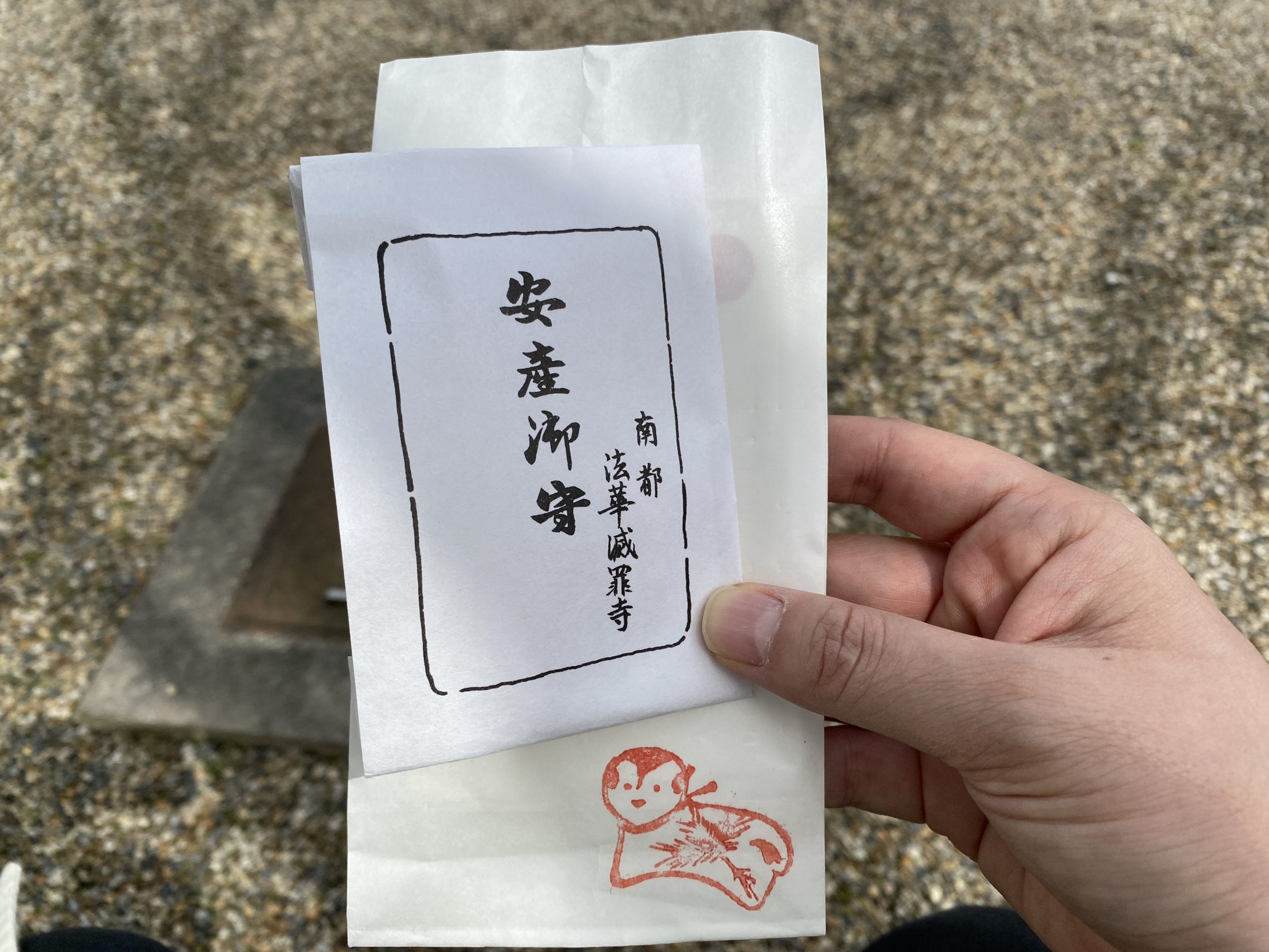 法華寺は奈良の帯解寺と並んで安産祈願で有名なお寺です。ここの安産守はお守りの中に「守り犬」という子犬の人形が入っています。なんでも、この人形は奈良時代から伝わるもので、限られた尼僧しか作れないそうです。昨年安産祈願ができてなかったので、早速購入しました。