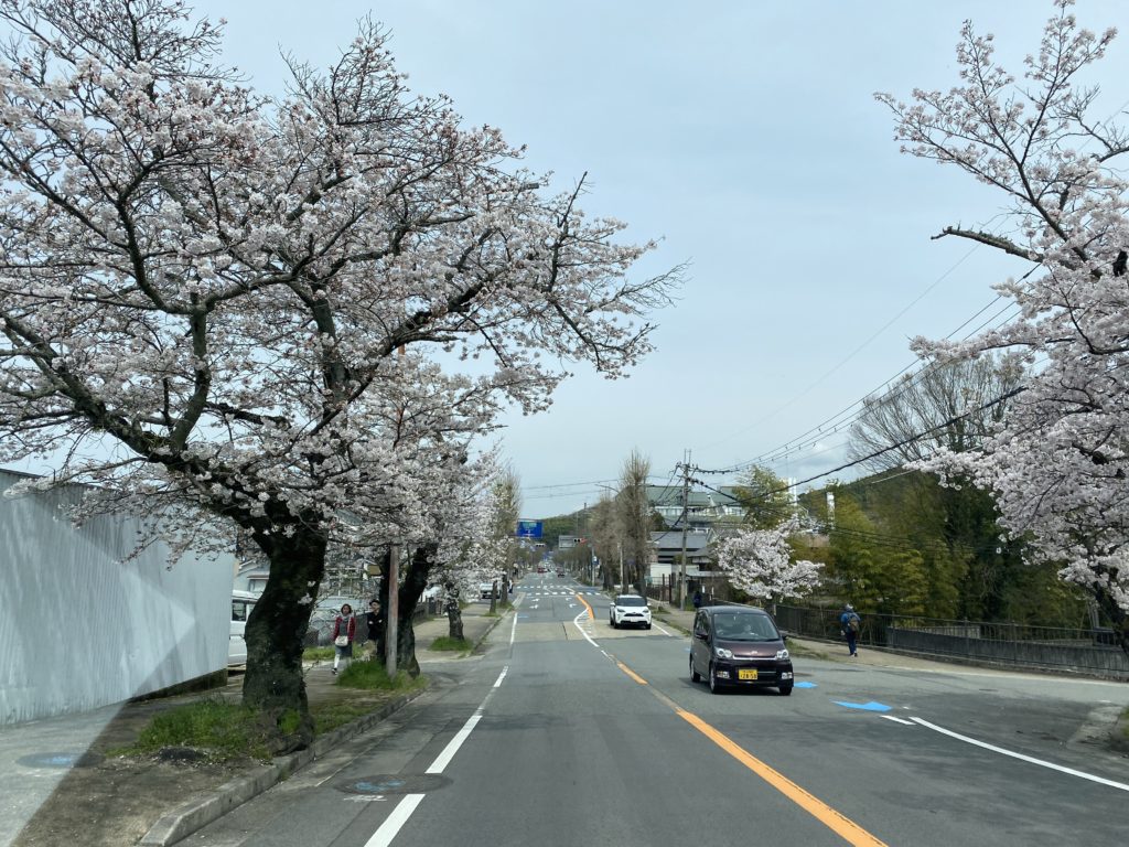 2024年は桜の開花が遅かったですが、石上神宮の前の道路の桜は満開でした。