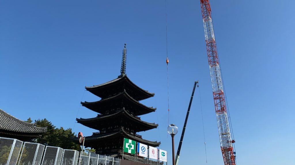 ちなみに五重塔と東金堂は幕で囲われており、外側からは中の様子が見えにくくなっていました。五重塔の隣には大きな赤と白のクレーンが作業を始めています。