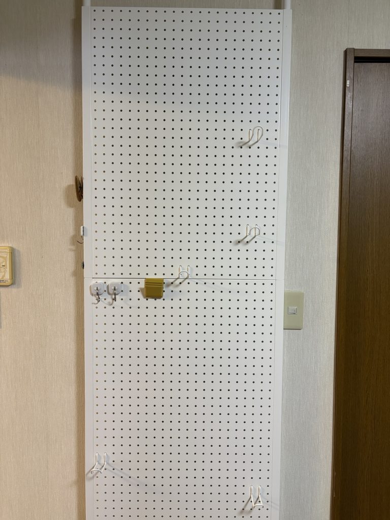 小さい子どもがいると落ちた画鋲を誤飲する可能性があり危険なので、フックでつるせるタイプの有孔ボードにチェンジしました。