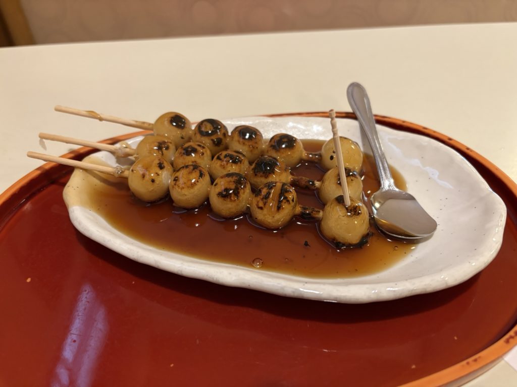 席についてお団子を注文。炙ってあるあたたかいみたらし団子が出てきました。いざ実食。